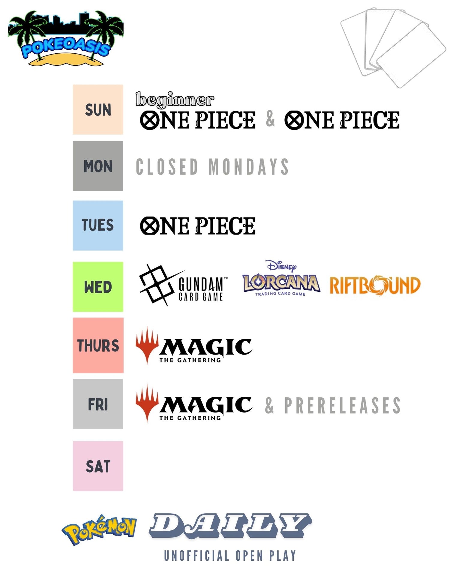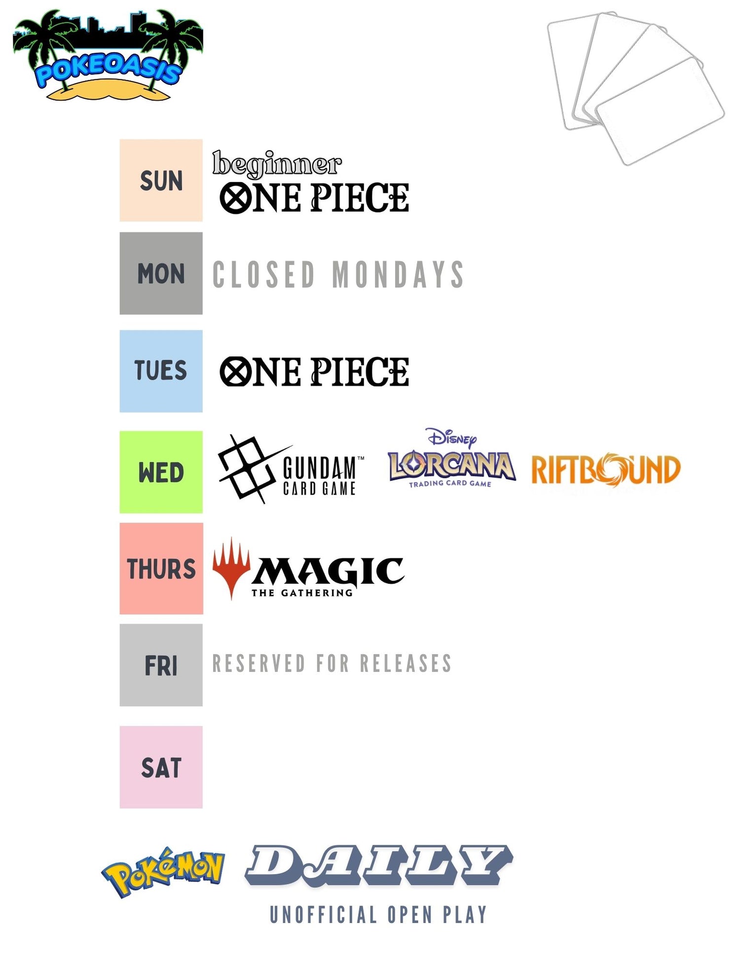We're an official play store for Gundam, One Piece, Magic the Gathering, Lorcana, and most recently, Riftbound! 🎉 If we do not have an event scheduled, please feel free to come in and play with your buddies during normal store hours.